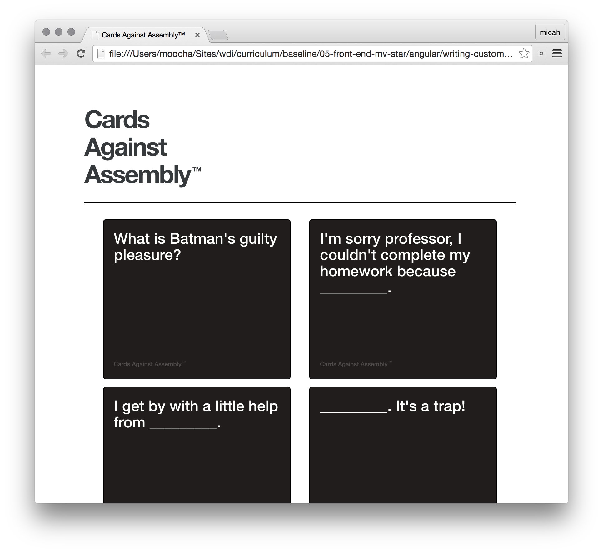 In context, you'll see that the ng-repeat is giving us the variable card, and we're actually just rendering that out as a string. But we've decided we want to have an attribute called question to pass data through. We made that up, it's appropriate to our example, but it can be anything.