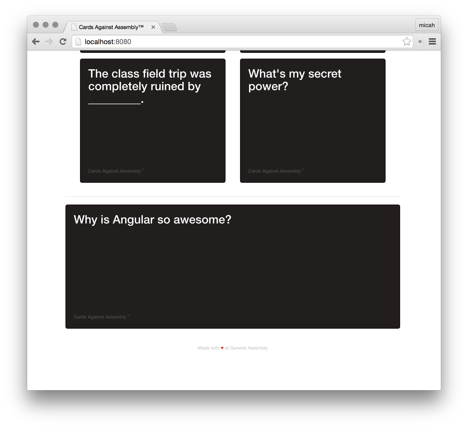 Somewhere outside the context of the controller, let's say just above the footer in our index.html, throw a handmade card in: