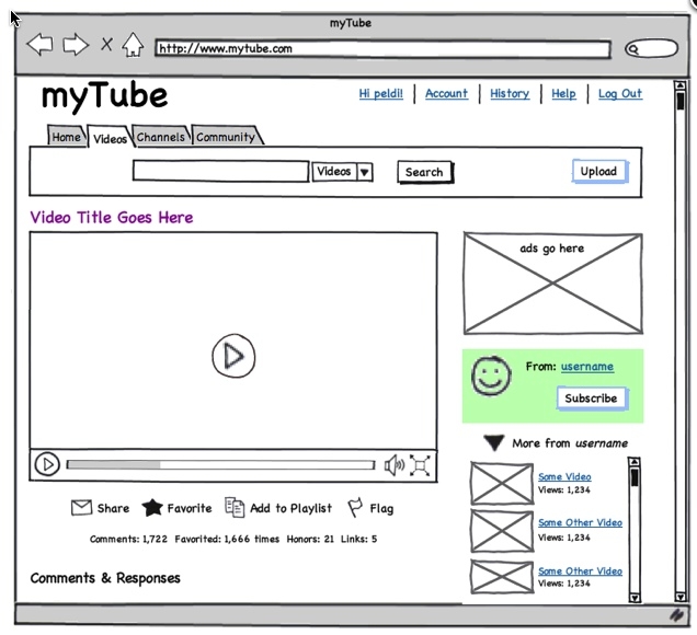 Let's look at the difference between YouTube's page for a particular video and how a wireframe compares: