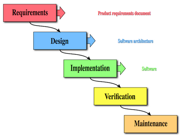 The waterfall model is a sequential design process, used in software development processes, in which progress is seen as flowing steadily downwards (like a waterfall) through the phases of Conception, Initiation, Analysis, Design, Construction, Testing, Production/Implementation and Maintenance.- Wikipedia
