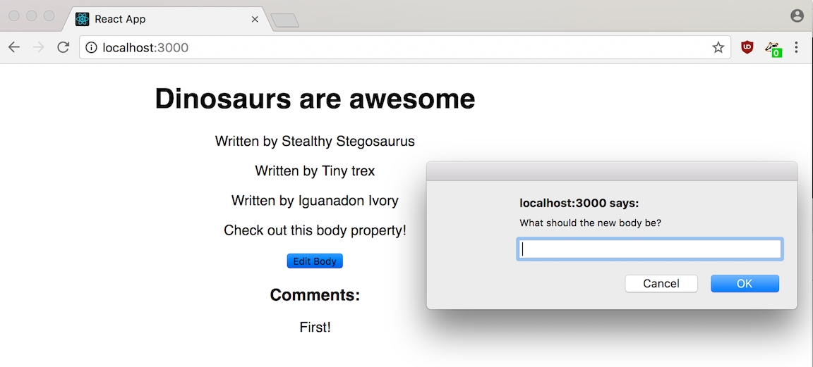 open an alert that takes a value.Take the user inputed value into the alert box and use that return value to update the state of the body or content of your post.