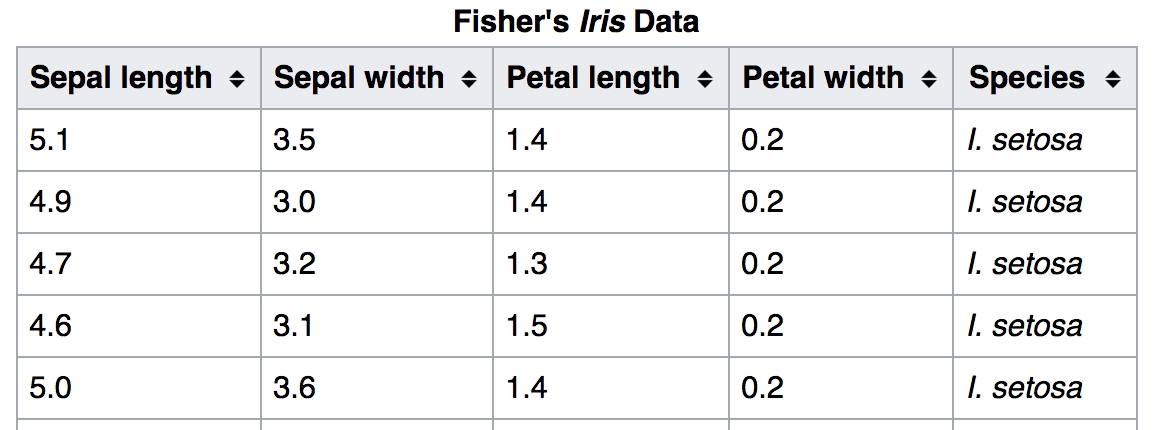 Get together with a partner. Take note of the ranges and averages of values you see for each of the measurements for each species. If I gave you a random data set of each of the petal and sepal sizes, would you be able to form a good guess as to what the species is?